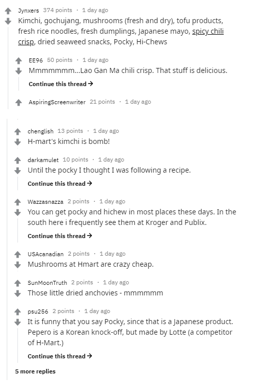 전부 미국에 사는 사람들이 한국마트에서 파는 식료품이 신선하고 값이 싸고 좋다는 것과 각자 먹어본 음식(특히 라면)에 대한 품평이 재미 납니다. 아래는 그 반응 입니다.