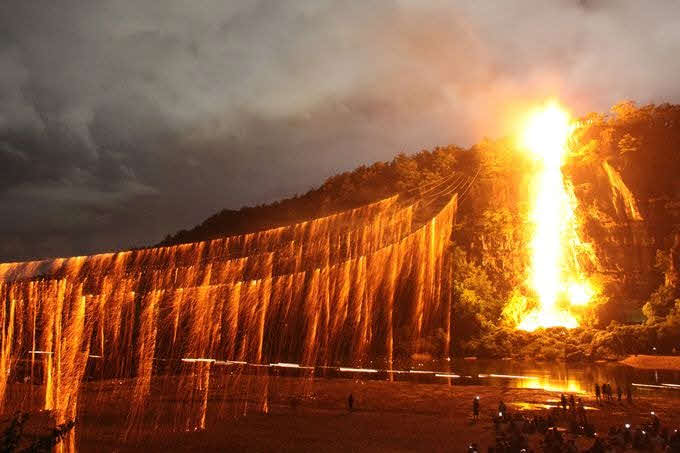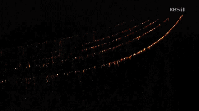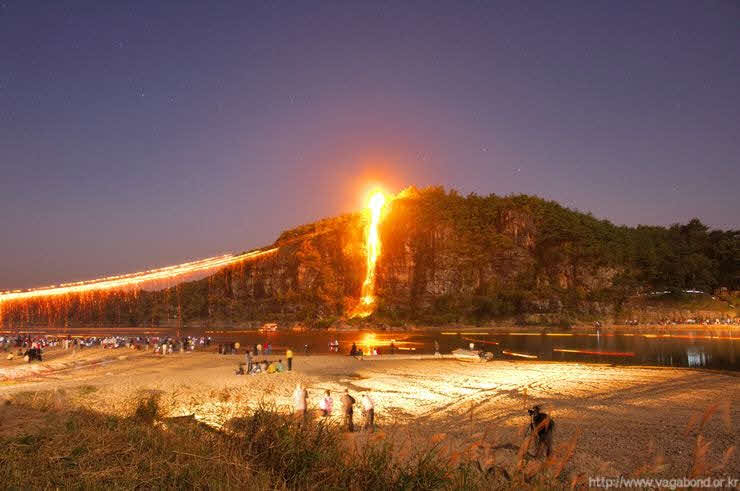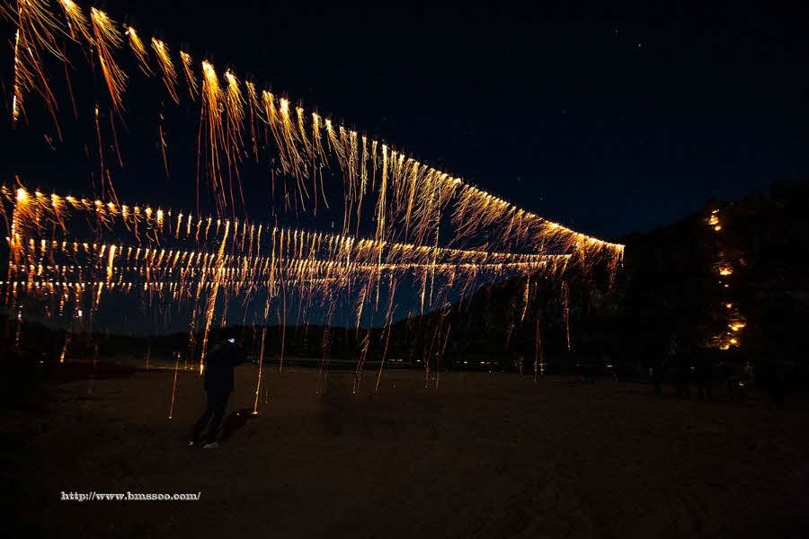 부용대 정상부터 낙동강 백사장의 만송정 까지 동앗줄을 걸고,그 줄에 수백개의 숫가루 봉지를 매달아 공중에서 불꽃이 은은하게 터져 떨어지게 한다.