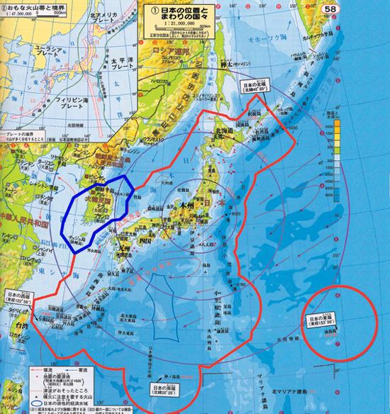 이 지도의 붉은 경계선 안에는 독도가 다케시마로 표기돼 일본 영해 안에 포함돼 있다. 뿐만 아니라 중국, 러시아 등 일본과 영토 분쟁을 일으키고 있는 지역까지 모두 일본의 영토와 영해로 표시하고 있다.