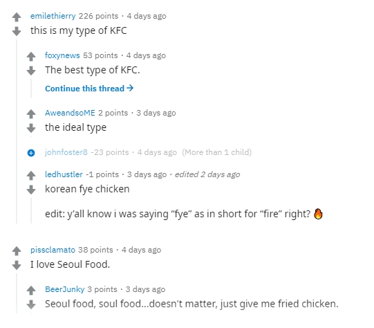 사진에 보여진 한국식 치킨에 대한 해외 네티즌 반응입니다. 최근에 한류 붐에 따라 한국의 여러 문화가 세계인들에게 알려져 있는 게 많지만.. 한국식 치킨도 널리 퍼져 있습니다. 아래는 그 반응들입니다.