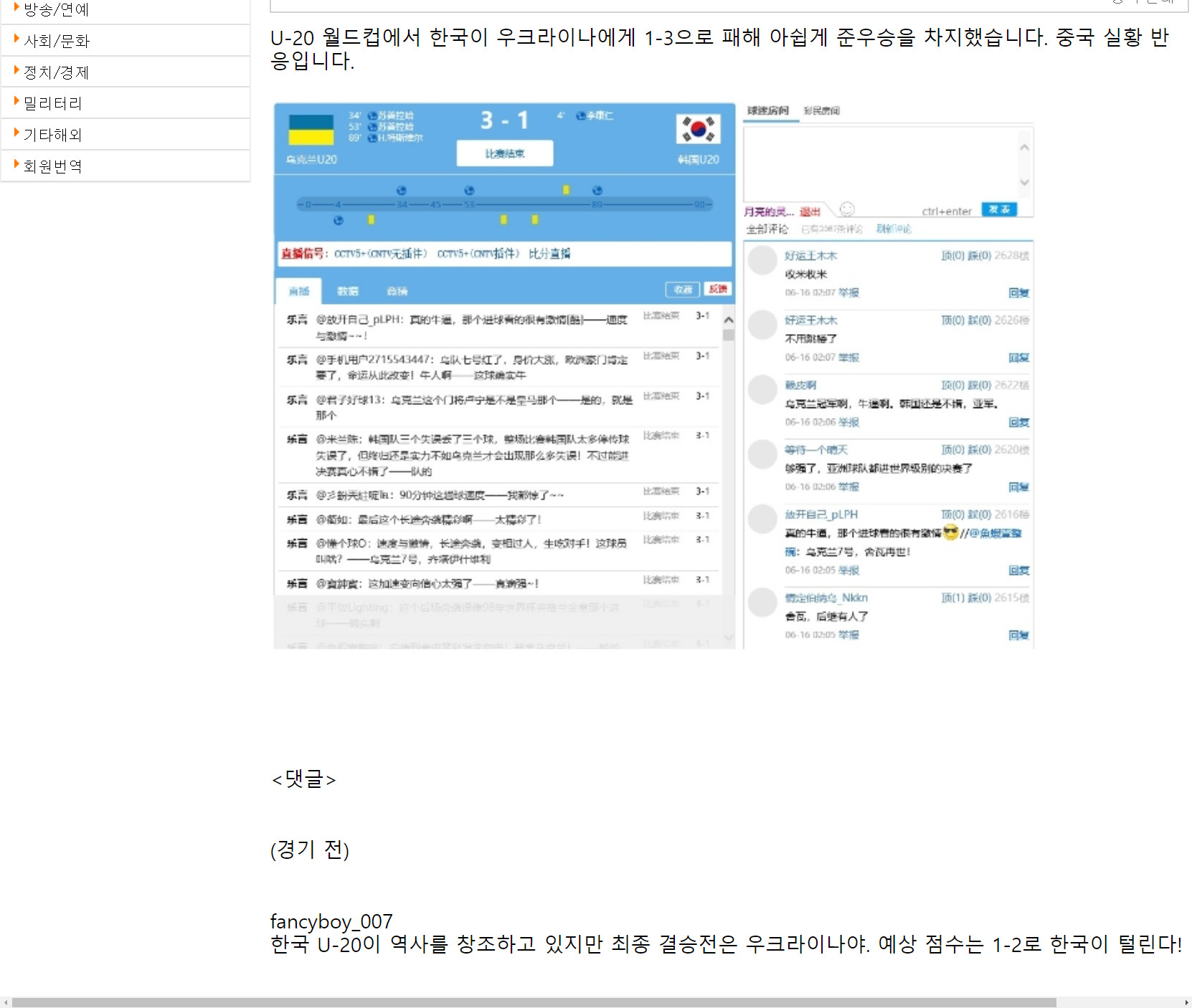 진짜 중국인으로서 인성 진짜...빵즈 빵즈 거리고 니네들이 남들을 깎아 내릴 권리가 있는 줄 아냐? 쟤네들은 최소한 결승전이라는 무대를 가기라도 했지. 20일 전에 내가 그랬지?? 한국팀은 분명히 우승한다고. 오늘 밤 한국팀은 반드시 우승해서 중국 축협과 중국 축구팬들에게 참교육을 시킬 것이다. 니네들이 내 말을 기억해준다면 중국 축구는 반드시 유스 레벨부터 성장해야하고 스스로의 부족함을 인정하지 못하면 니네들은 계속 낙후될거야!