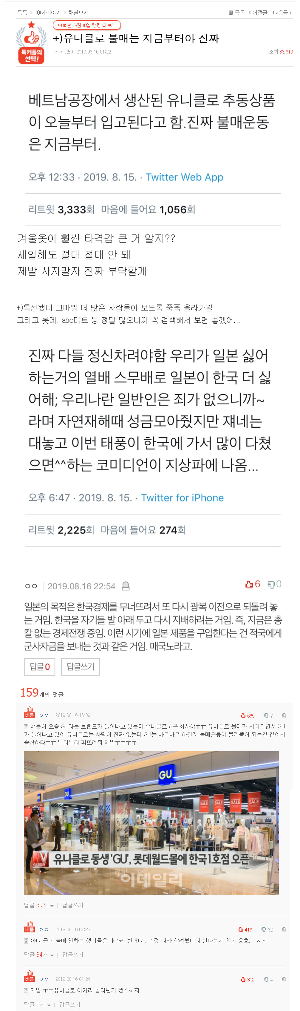 유니클로 불매는 지금부터라고 말하는 대한민국의 자랑스러운 10대 아이들..