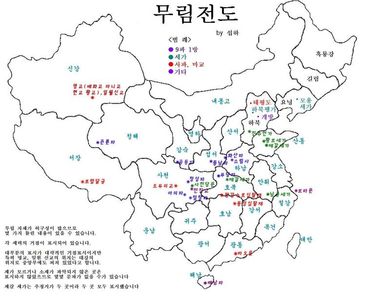 그렇게 궁금해하는 사람들(저 같은) 때문에 고수분들에 의해 지도 제작을 하게 되었으며 무림지도가 만들어졌습니다.